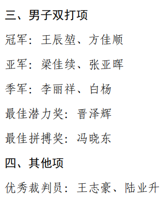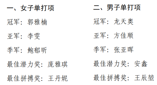 当最终成绩表定格,荣耀实至名归女,本次比赛中,女子单打、男子单打、男子双打3个项目产生冠军、亚军、季军12人,最佳潜力奖、最佳拼搏奖6人,优秀裁判员2人,而那些未站上领奖台的选手也收获了成长。