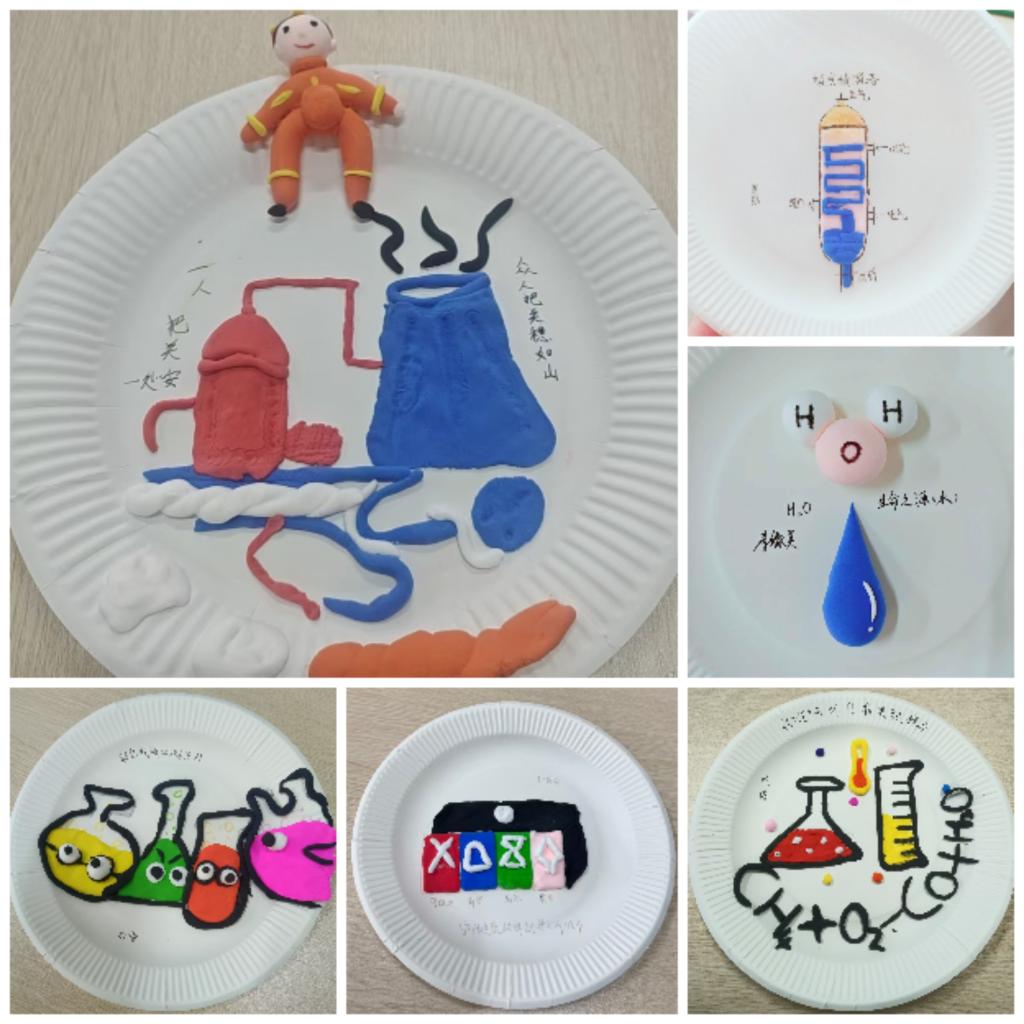 宣讲结束后,新生们以彩泥为创作载体、纸盘为展示平台,展开创意实践。作品聚焦化工专业特色,既有模拟化工生产装置并搭配“一人把关一处安,众人把关稳如山”安全标语的设计,也有还原化学仪器、核心公式的具象呈现,更有以彩泥精准拼搭分子结构、实验器具的创意表达,用手工艺术传递对专业知识的理解与热爱。