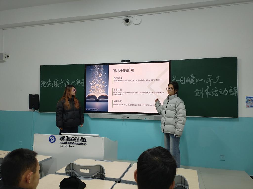 12月3日,化工工程系“工创青春”团学宣讲小队走进25级新生班级,以“青春与创新”为主题,融合专业实践与手工创作,用鲜活的化工行业创新案例——从新型环保催化剂的研发到精细化工产品的创意改良,生动诠释了创新思维在专业领域的重要价值。同时,引导新生思考“手工创作中小而精与化工实验的严谨性异曲同工”,启发大家将专业学习中培养的逻辑思维、细节把控融入手工创作。